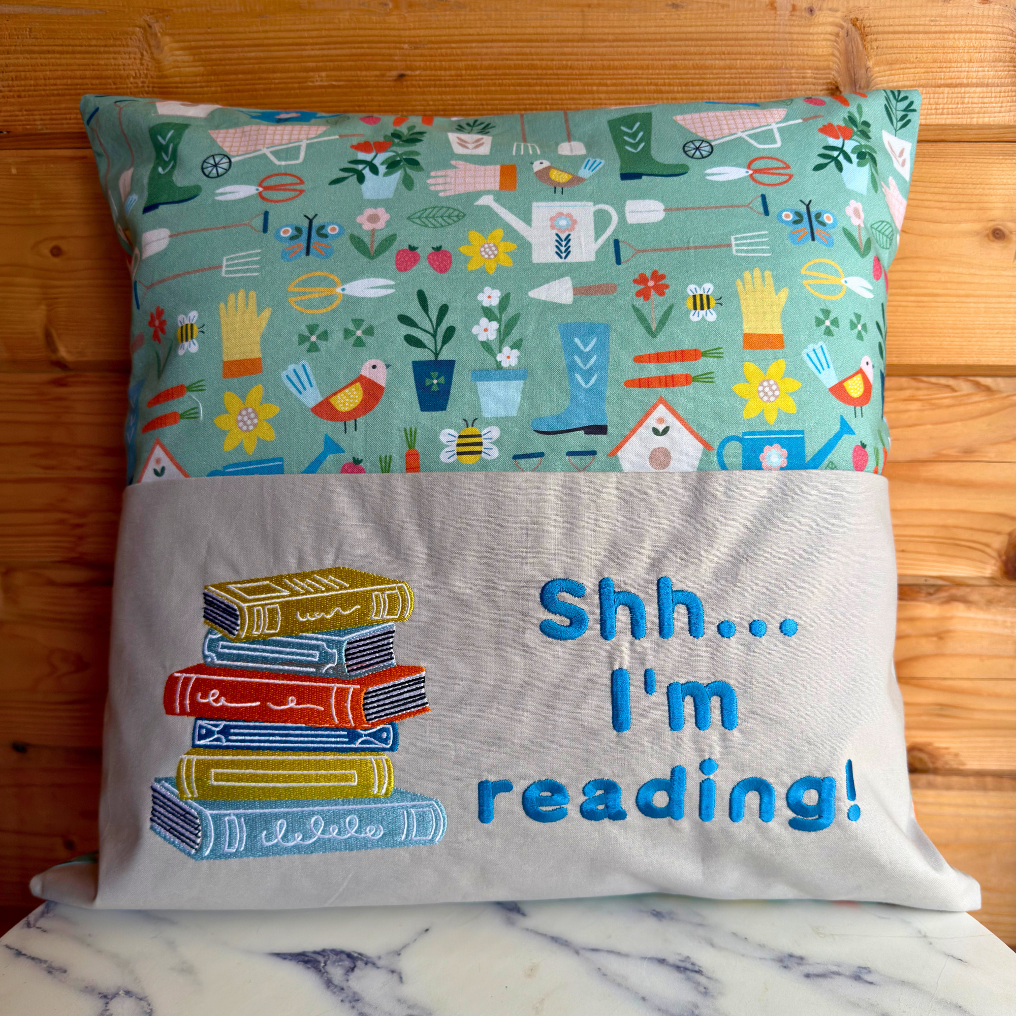 Handmade embroidered reading book cushion. The pocket is made with a coordinated fabric and is embroidered with the phrase "Shh... I'm reading!".