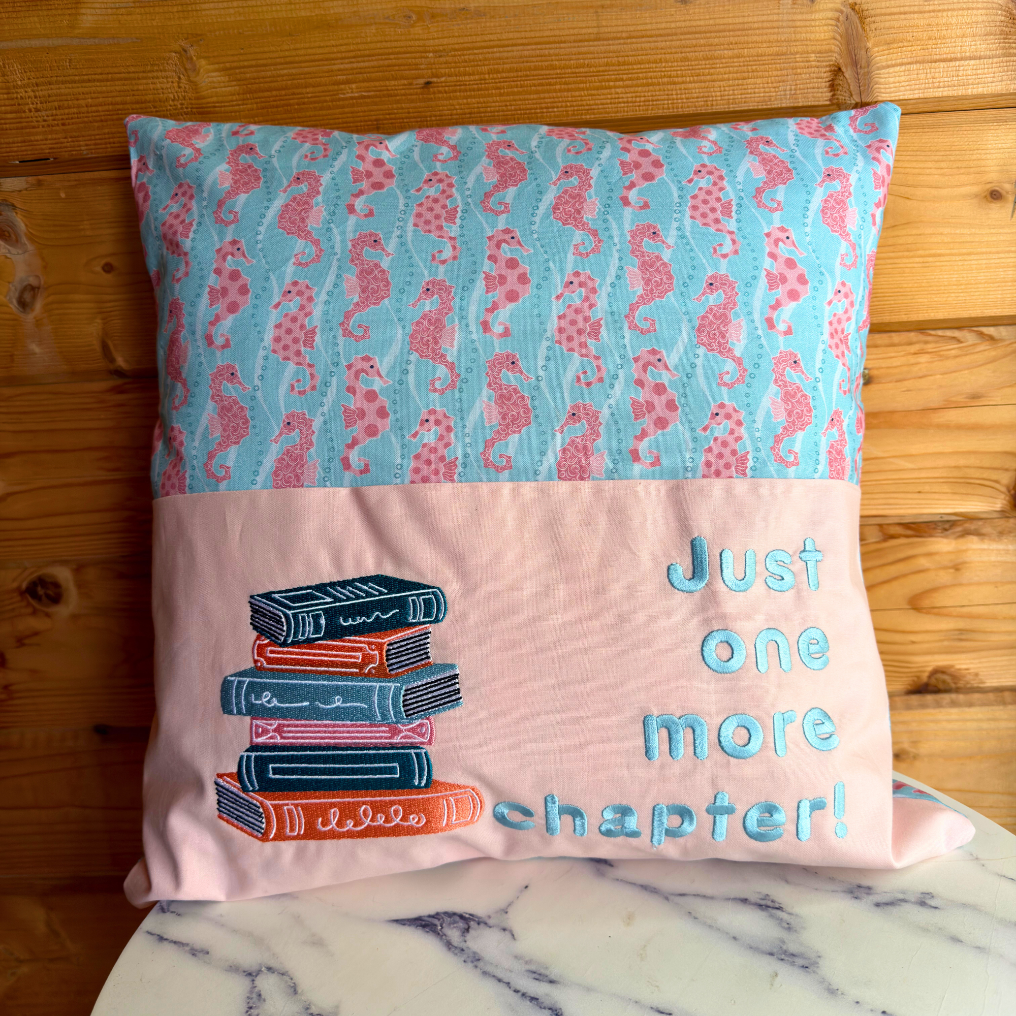 Handmade embroidered reading book cushion. The pocket is made with a coordinated fabric and is embroidered with the phrase "Just one more chapter!".