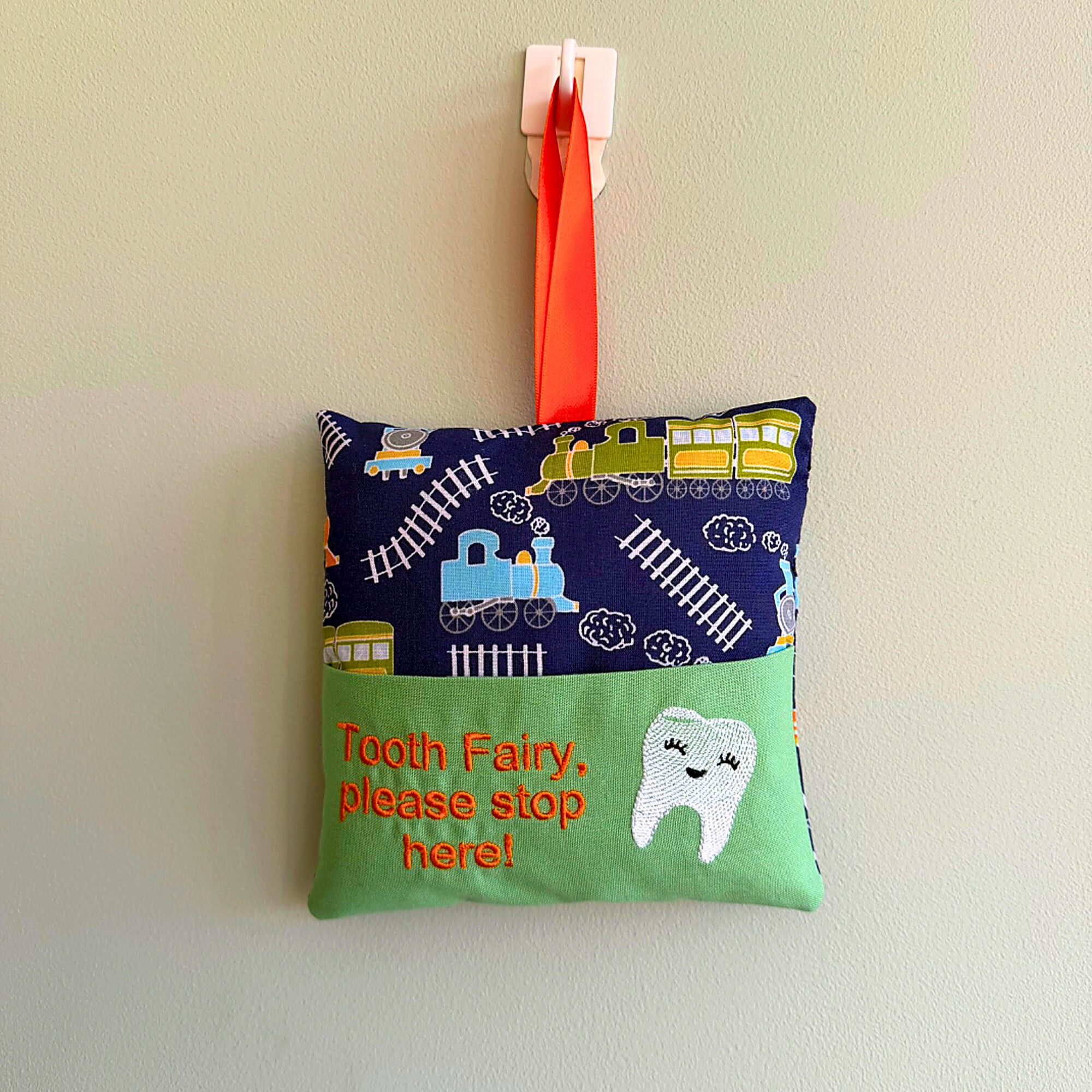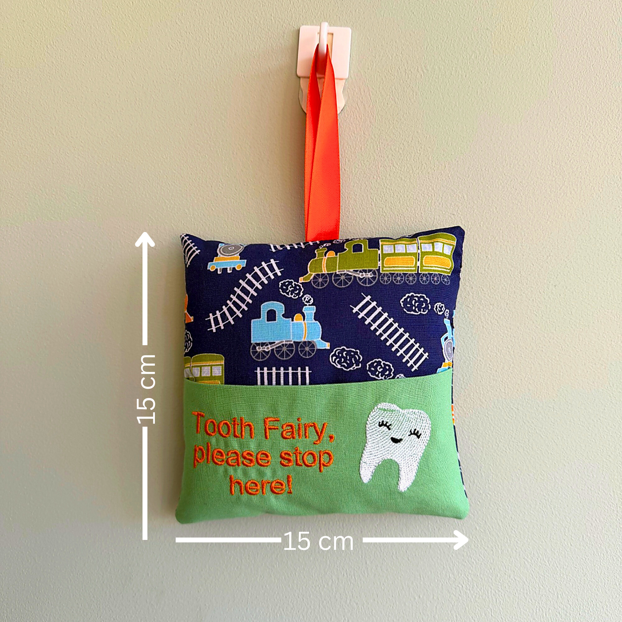 A lovely little cushion which can be hung beside the bed or on the door. Perfect for keeping little teeth safe until the Tooth Fairy collects and leaves a little gift in the pocket.