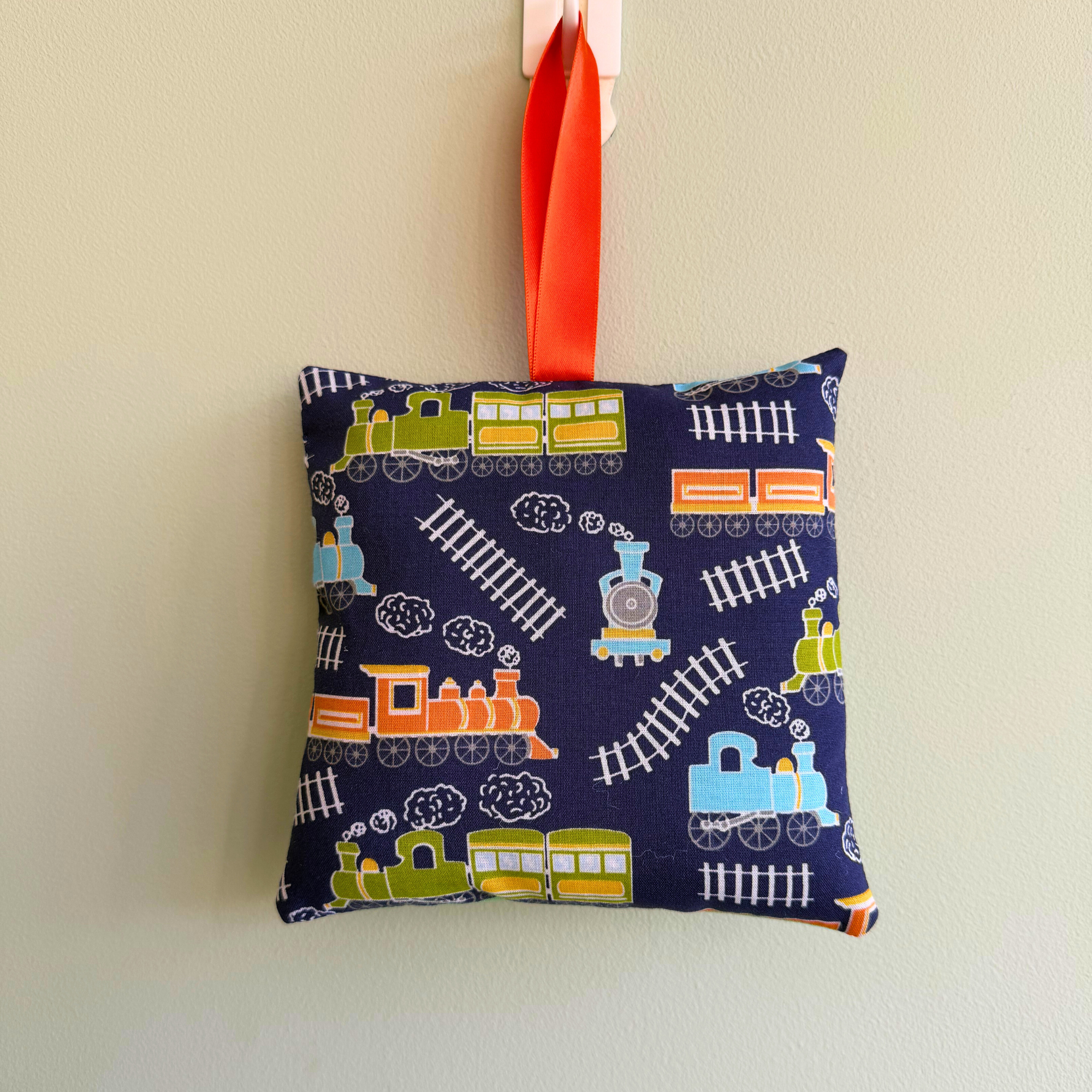 Children's Tooth Fairy Cushion in navy train print.