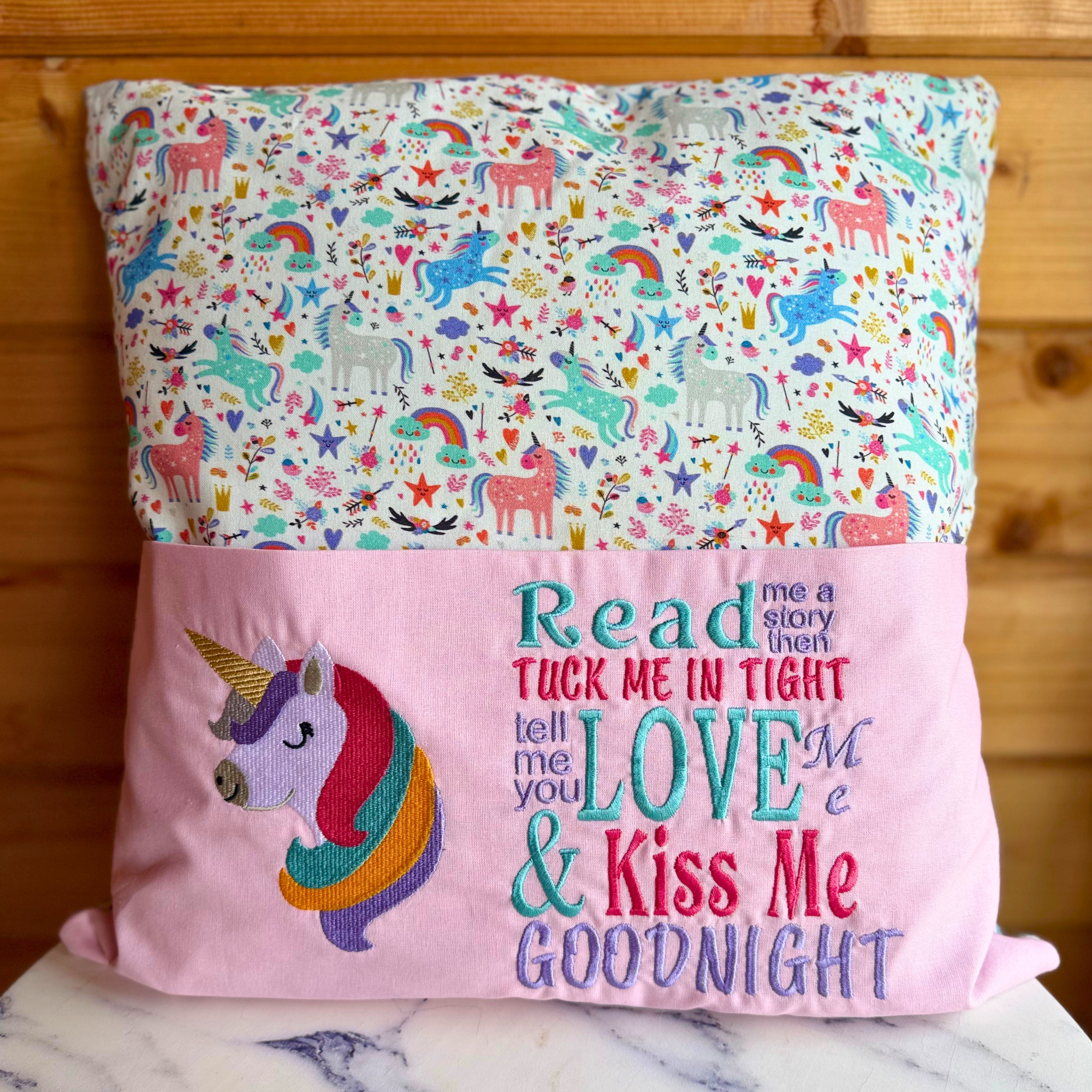 Handmade embroidered reading book cushion. The pocket is made with a coordinated fabric and is embroidered with the phrase "Read me a story, tuck me in tight, tell me you love me and kiss me goodnight".