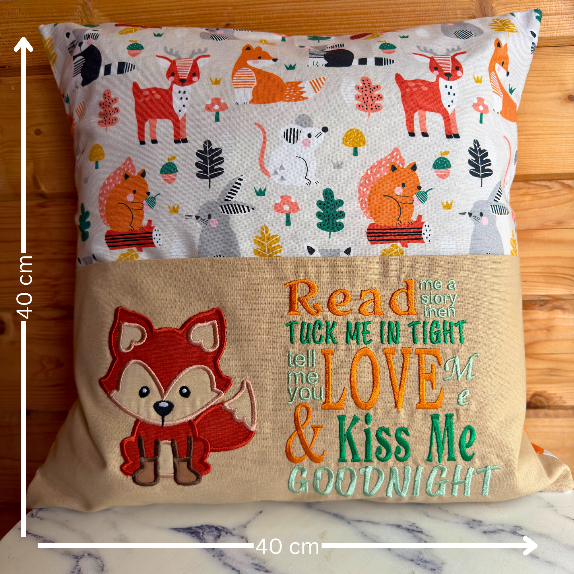 Handmade embroidered reading book cushion. The pocket is made with a coordinated fabric and is embroidered with the phrase "Read me a story, tuck me in tight, tell me you love me and kiss me goodnight".